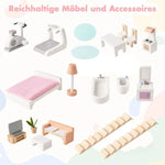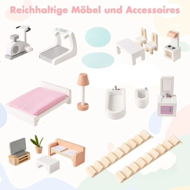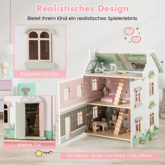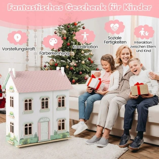 Mit diesem eleganten Puppenhaus für kleine Mädchen entsteht für Ihr Kind eine bezaubernde Welt. Mit seiner pastellfarbenen Fassade, dem kunstvoll gearbeiteten Dach und den ausgestatteten Fenstern erinnert es an die schönen Häuser von einst. Im Inneren ermöglichen mehrere Räume, Alltagsszenen nachzustellen und der Fantasie freien Lauf zu lassen. Es ist aus massivem Holz gefertigt und vereint hohe Qualität mit stundenlangem sicherem Spielspaß. Ein ideales Geschenk, um die Kreativität anzuregen und Geschichten zu erfinden.