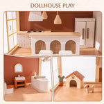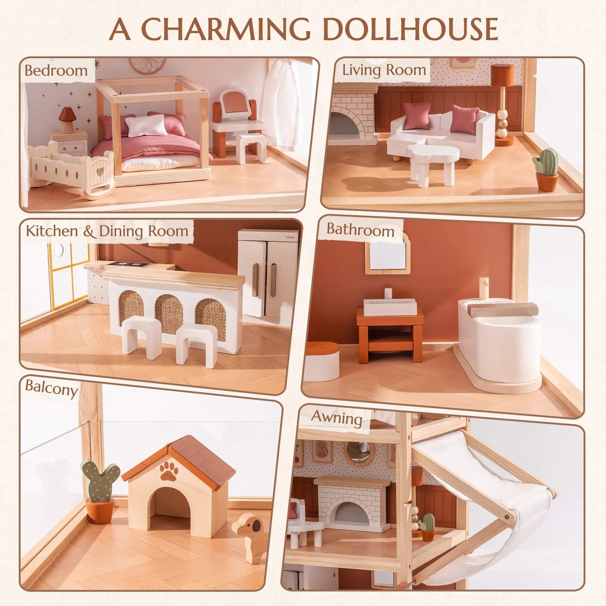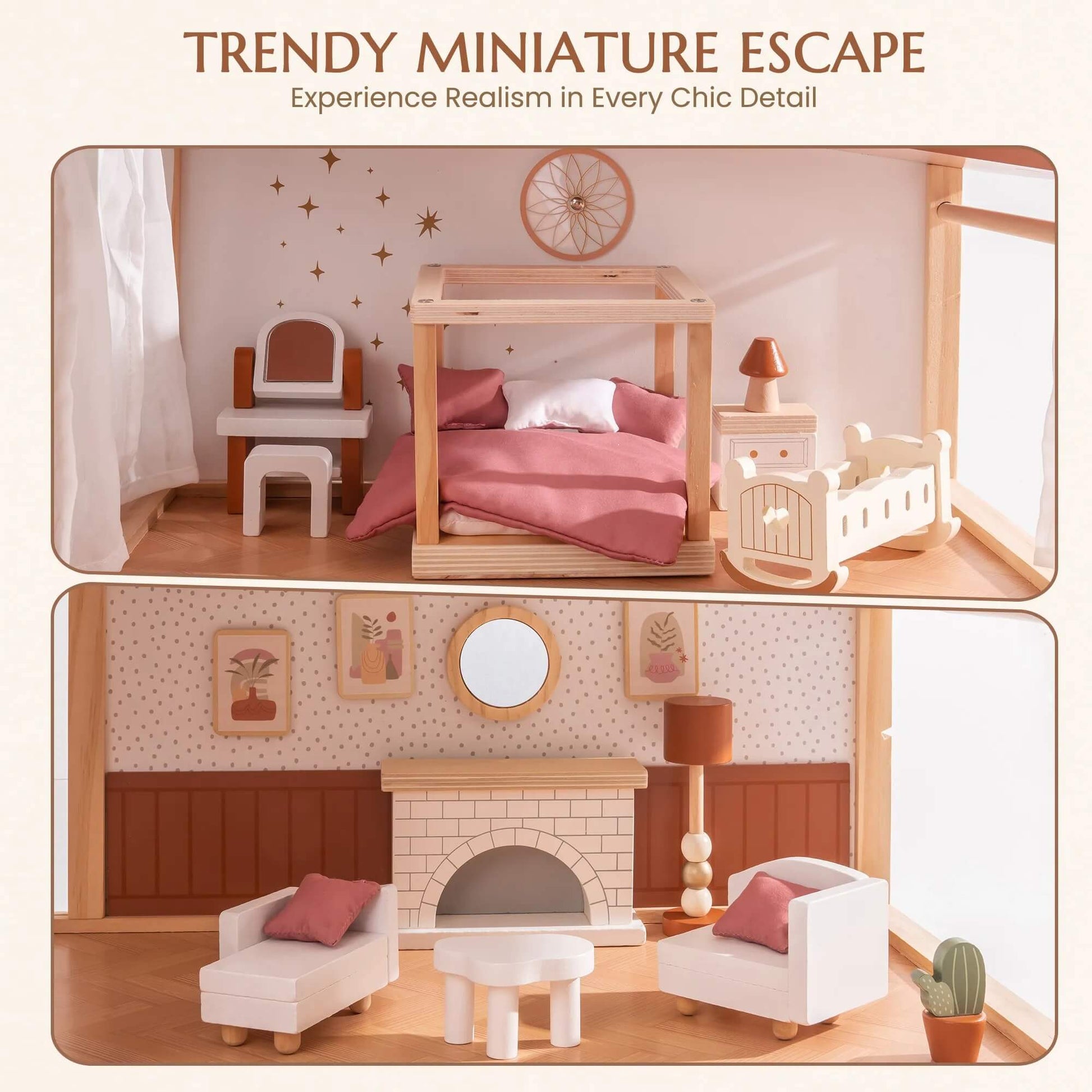 Mit ihrem zeitgemäßen und zeitlosen Design lädt dieses moderne Puppenhaus aus Holz zum kreativen Spielen ein. Seine Struktur und seine gemütliche Einrichtung erinnern an skandinavische Innenräume. Die Räume sind hell und die Details sorgfältig und präzise gearbeitet. Die Etagen bieten realistische Räume: ein Wohnzimmer, eine Küche, ein Schlafzimmer und sogar ein Badezimmer. Dieses pädagogische Spielzeug fördert die Fantasie, das Erzählen von Geschichten und den Austausch mit Kindern.