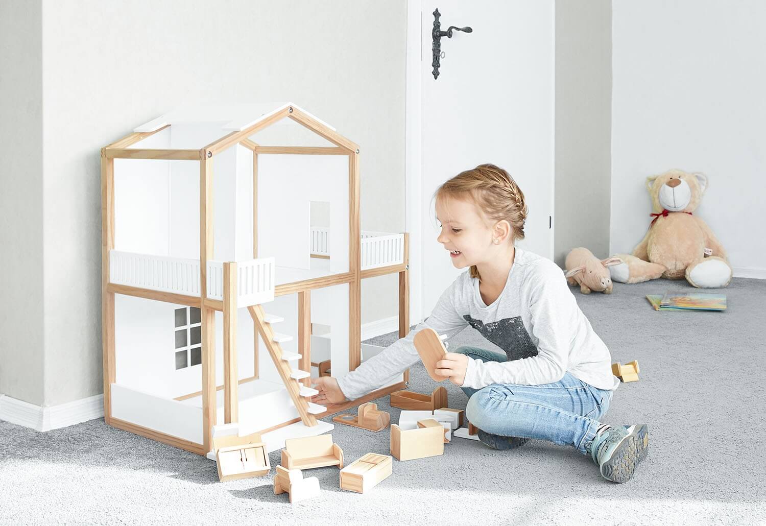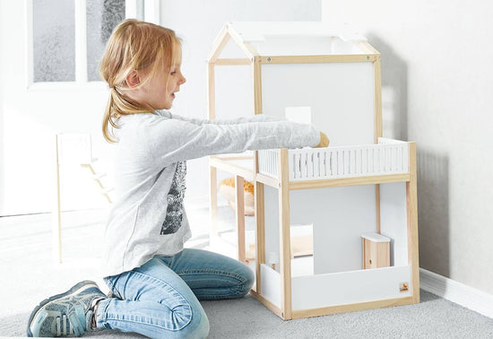 Dieses Puppenhaus für Mädchen wurde entwickelt, um die Fantasie anzuregen und vereint Modernität und Schlichtheit. Die mit natürlichen Oberflächen verzierte Holzstruktur unterstreicht den geräumigen Innenraum, der sich über zwei Etagen erstreckt. Die Räume, vom Wohnzimmer bis zum Schlafzimmer, laden Kinder dazu ein, sich nach Lust und Laune Geschichten auszudenken. Das verwendete Holz sorgt für ein robustes Spielzeug. Dieses Modell wird sowohl für sein Design als auch für seine endlosen Spielmöglichkeiten geschätzt. Ein originelles Geschenk zur Förderung der Kreativität.