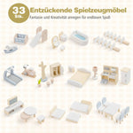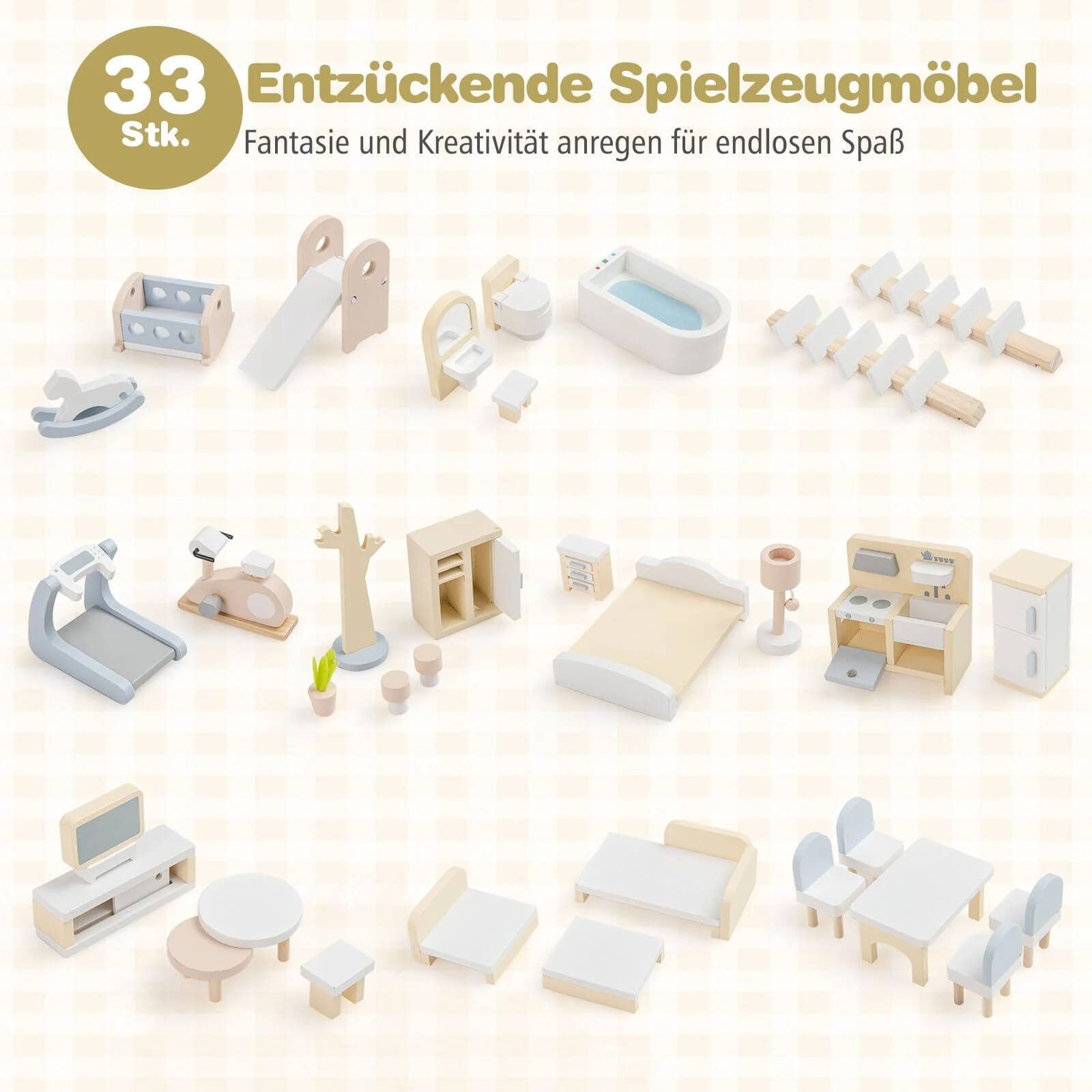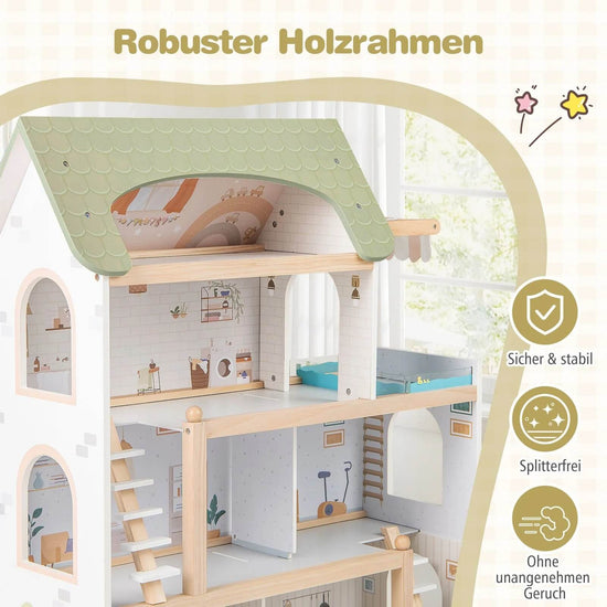 Dieses Puppenhaus mit Swimmingpool entführt Kinder in eine Welt, die den schönsten Ferienvillen würdig ist. Jede Etage wurde sorgfältig durchdacht: ein gemütliches Wohnzimmer, komfortable Schlafzimmer und sogar ein modernes Badezimmer. Der hängende Garten umfasst einen Pool, in dem sich die Puppen entspannen können. Das aus Holz gefertigte Haus vereint Schönheit und Robustheit und ist somit besonders langlebig. Dank des zahlreichen Zubehörs können die Kleinen spannende Geschichten erfinden und ihre Fantasie entwickeln.