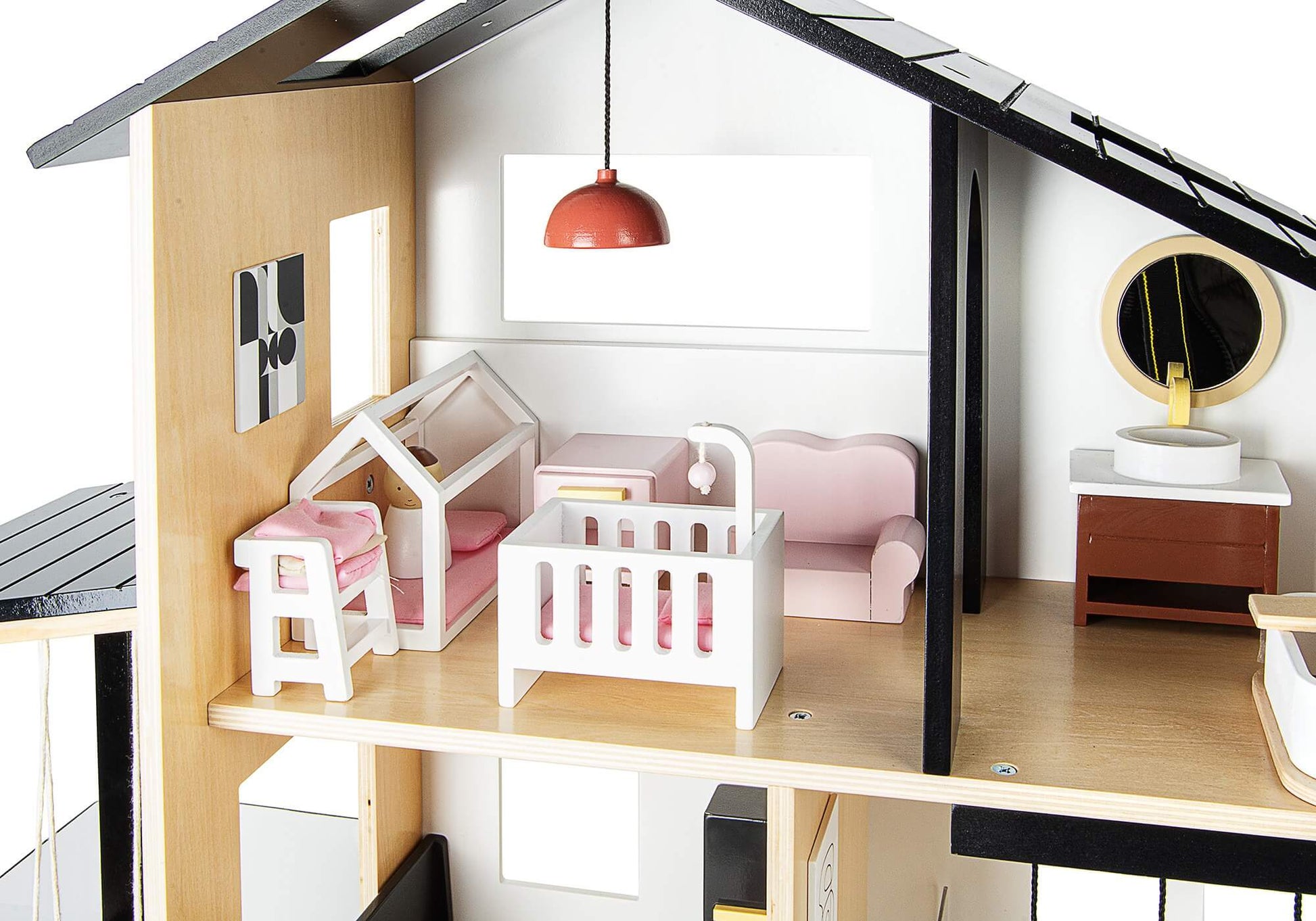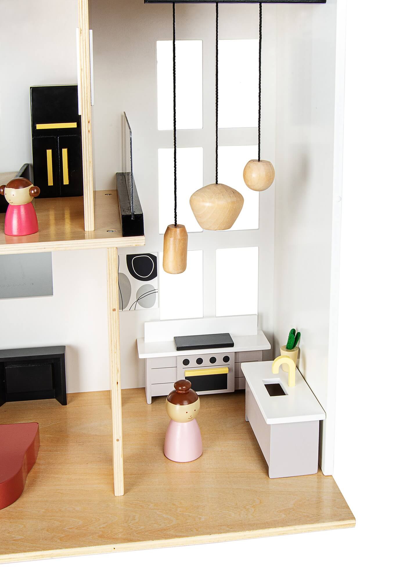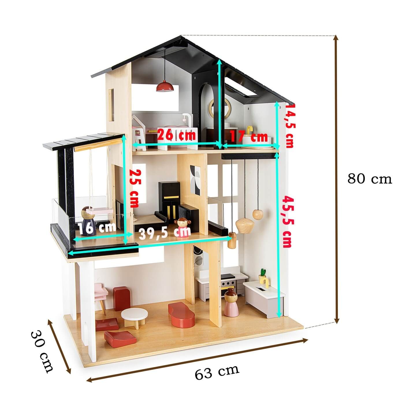 Die Kinder profitieren von einem geräumigen Spielbereich, der für mehrere Puppen und zahlreiche mitgelieferte Accessoires ausgelegt ist. Das sorgfältig verarbeitete Holz garantiert eine lange Lebensdauer. Dieses Haus ist nicht nur ein Spielzeug, sondern auch eine Inspirationsquelle, die die Fantasie und Kreativität anregt.