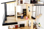 Dieses XXL-Puppenhaus, das wie eine echte Villa präsentiert wird, beeindruckt durch seine großzügigen Räume und sein modernes Design. Auf drei vollständig eingerichteten Etagen befinden sich Wohnzimmer, Küche, Schlafzimmer und Badezimmer. Es bietet somit einen geeigneten Rahmen für Kinder, um vielfältige Geschichten zu erfinden.