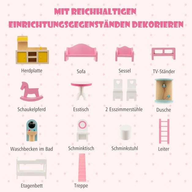 Entführen Sie Ihre Kinder in eine Traumwelt mit diesem großen Puppenhaus in leuchtenden Farben. Es erstreckt sich über mehrere Etagen und bietet dekorierte und ausgestattete Räume, die die Fantasie anregen und zu kreativem Spielen einladen. Das aus Holz gefertigte Puppenhaus vereint Ästhetik und Langlebigkeit und begleitet Ihre Kinder über Jahre hinweg bei ihren Geschichten. Mit seinem rosa Dach und den enthaltenen Elementen ist es ein echtes Deko- und Spielobjekt für jedes Kinderzimmer.