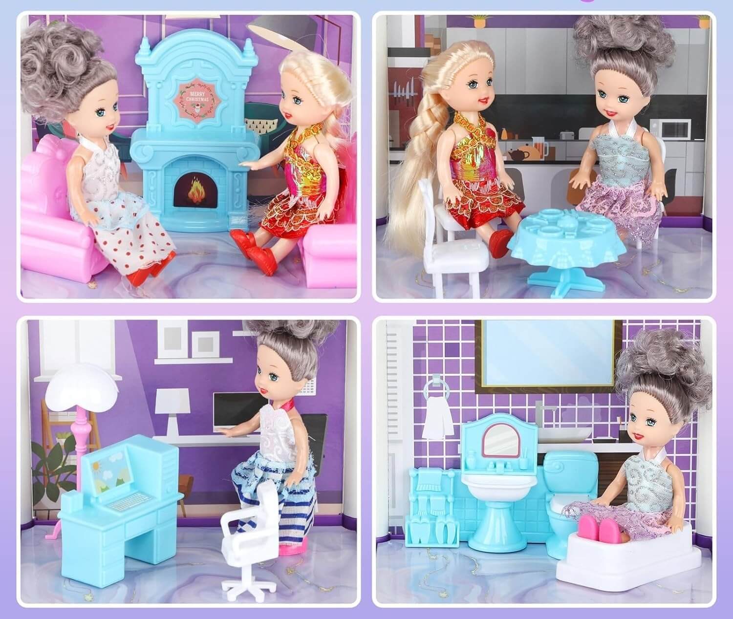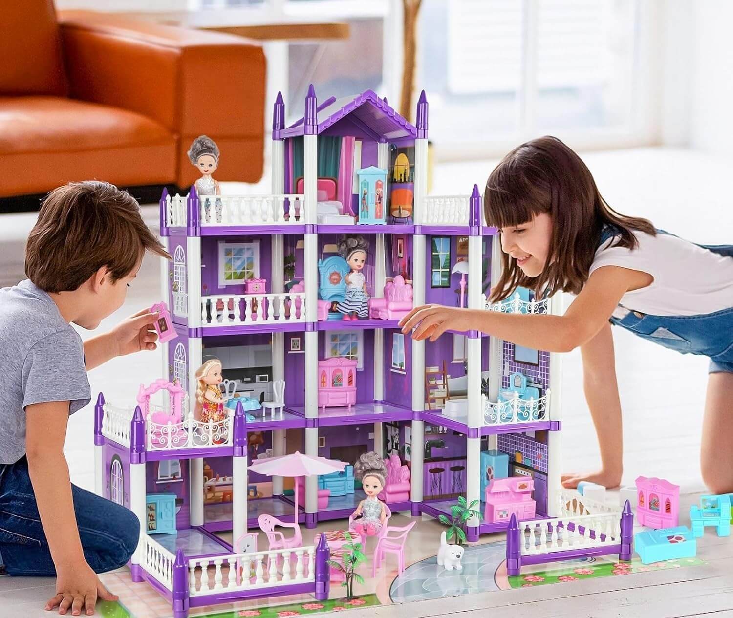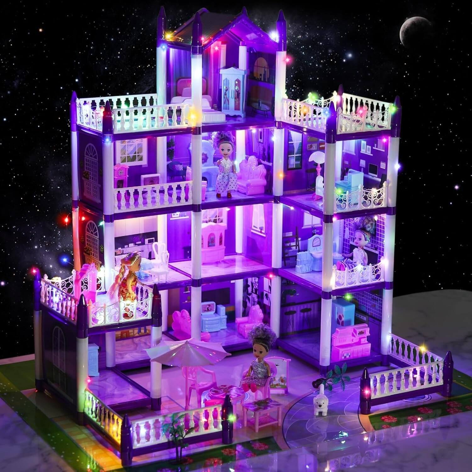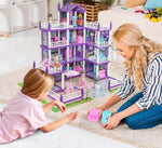 Mit diesem riesigen Prinzessinnen-Puppenhaus erwartet Kinder ein Miniatur-Spielzeugpalast. Hier werden Puppen zu Königinnen ihrer Welt: Sie können Gäste in einem großen Wohnzimmer bewirten und auf den offenen Terrassen speisen. Die violetten und weißen Farben, kombiniert mit den Balustraden, verleihen dem Ganzen den Look eines Disney-Schlosses.